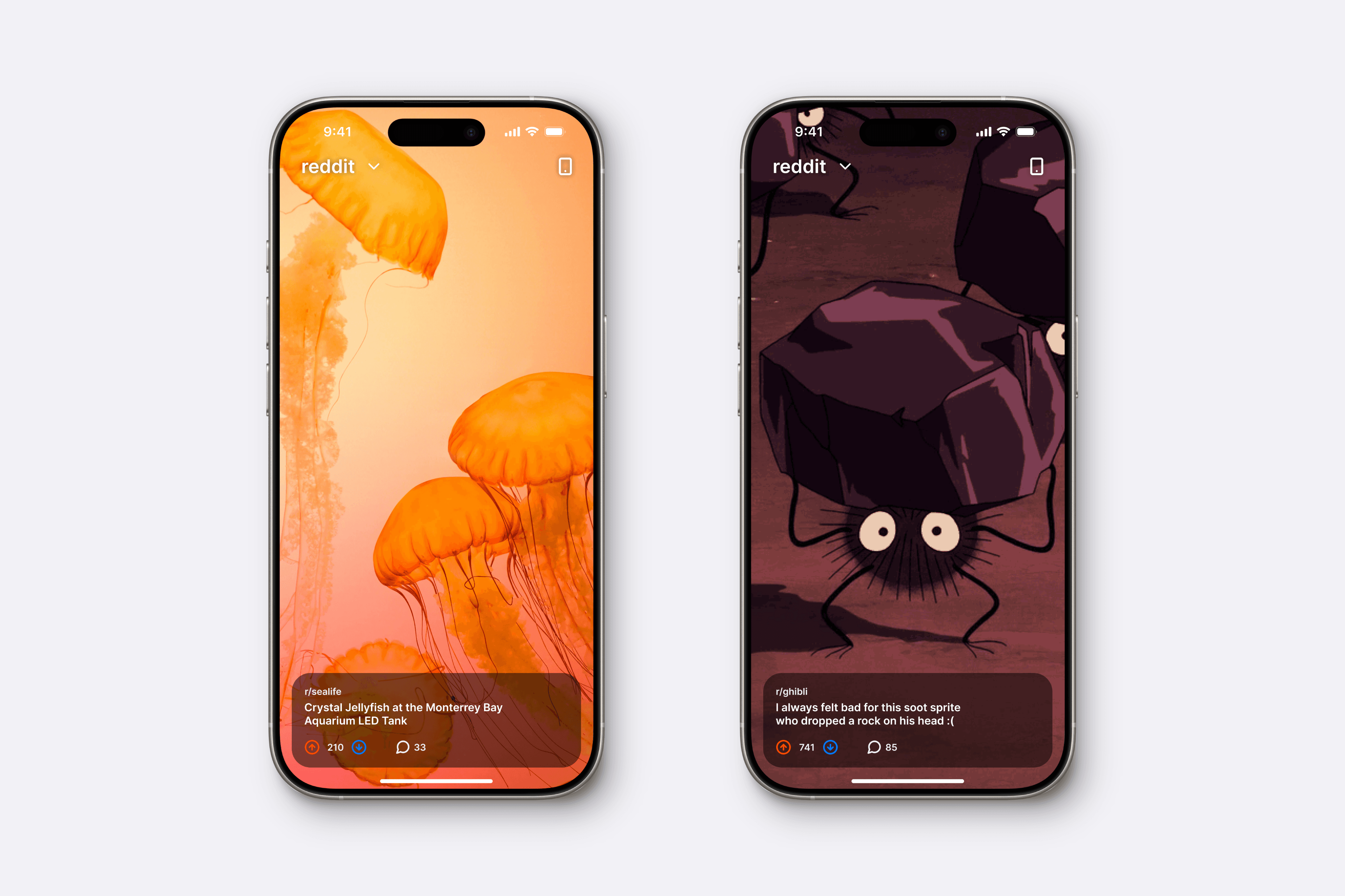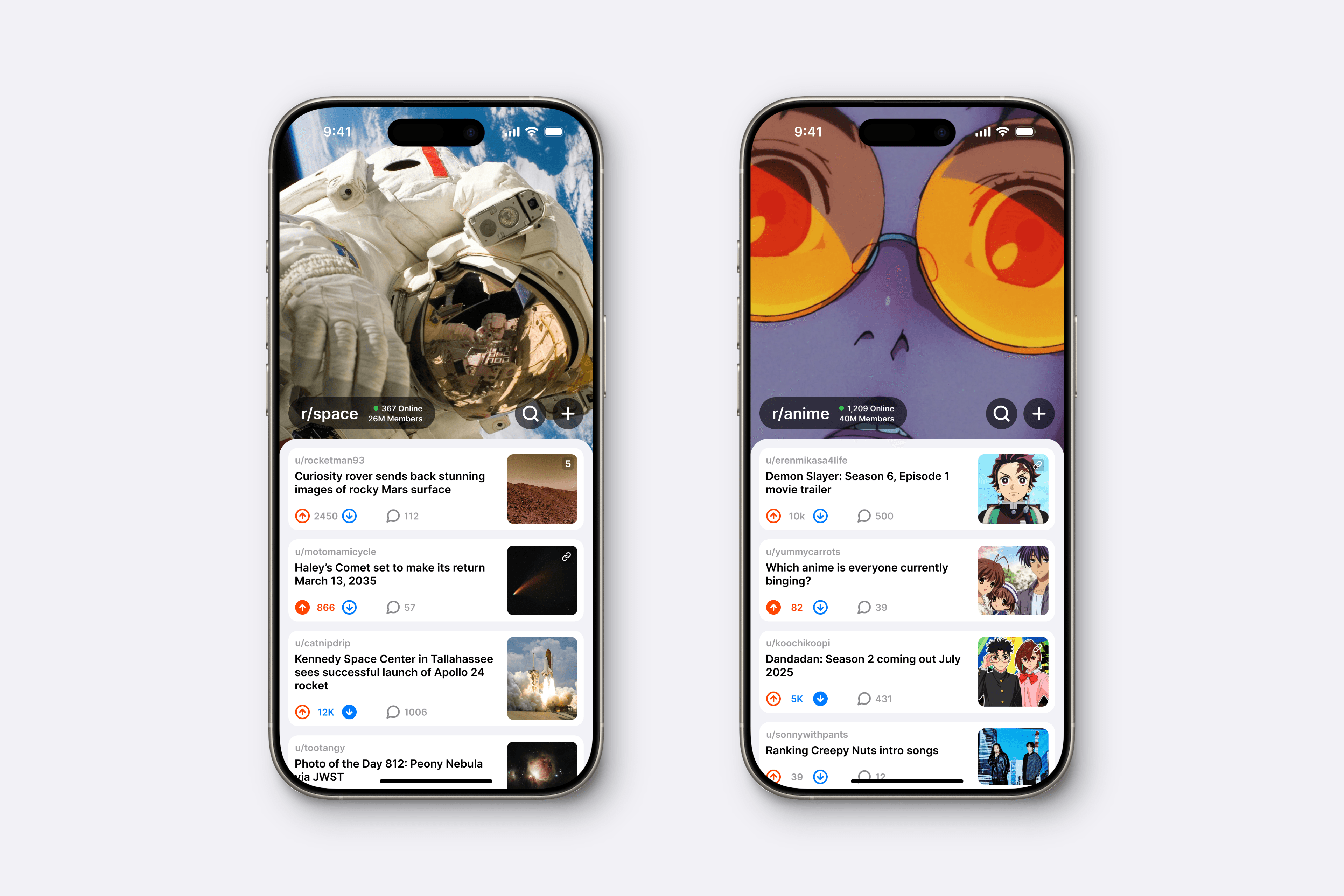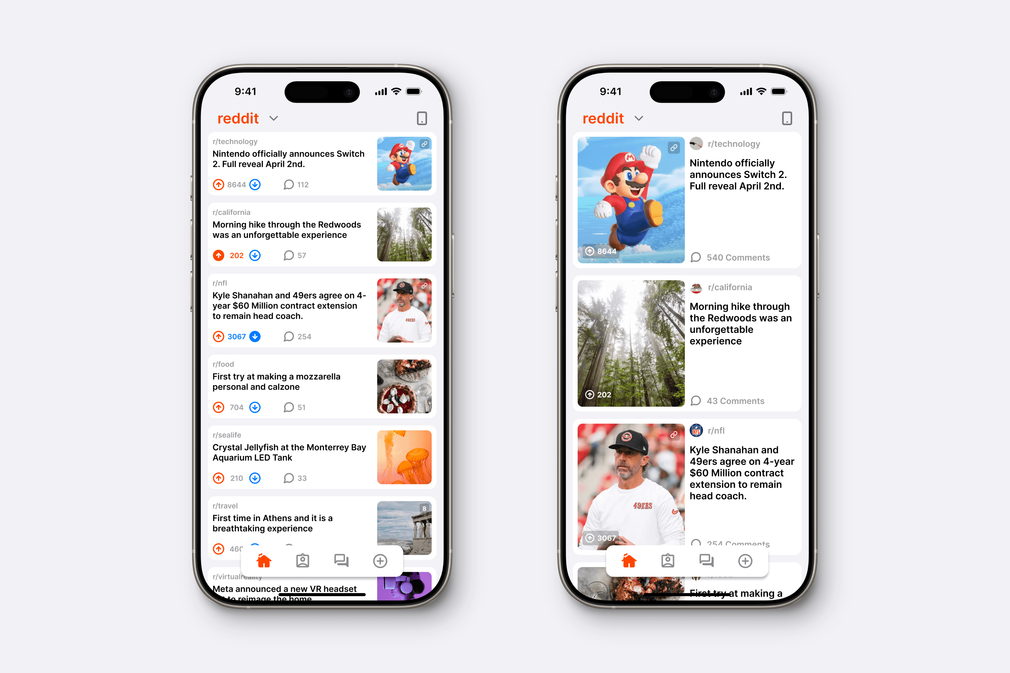 We reduced the vertical size of the list items while increasing thumbnail size and maintaining the same font size. Additionally, a floating nav bar provides a more immersive feel. Colored upvote/downvote arrows gives posts branding and improves scanability.
