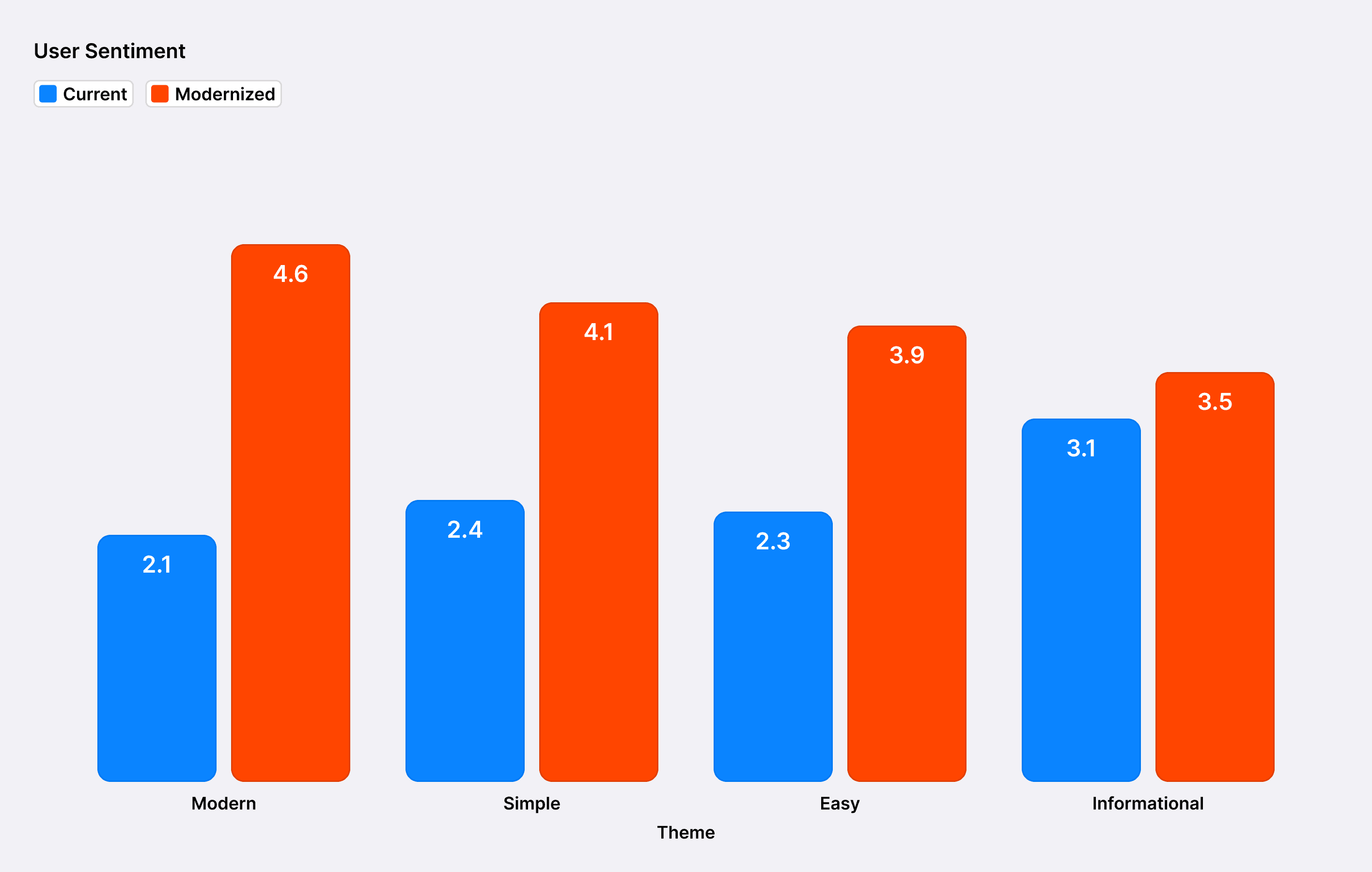 The redesign improved scores in all of our identified themes. Modernity, simplicity, and ease of use saw the biggest jumps in user sentiment, while the increase in informational was much smaller. A follow-up study to identify how users quantify how informational reddit app is necessary to further identify solutions for future iterations.